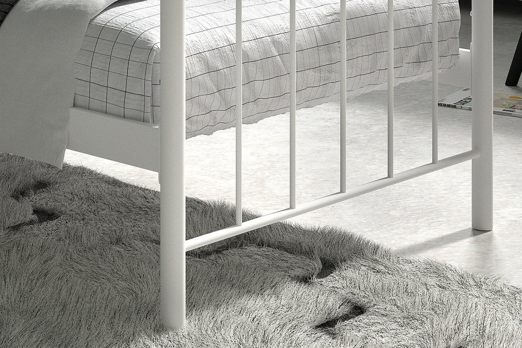 Het bed is vervaardigd uit stevig gepoedercoat metaal en wordt geleverd inclusief een duurzame lattenbodem voor optimale ondersteuning van elk type matras. De solide constructie zorgt voor langdurige stabiliteit, terwijl het open onderstel zorgt voor een luchtig gevoel in de kamer én praktische opbergruimte onder het bed.
