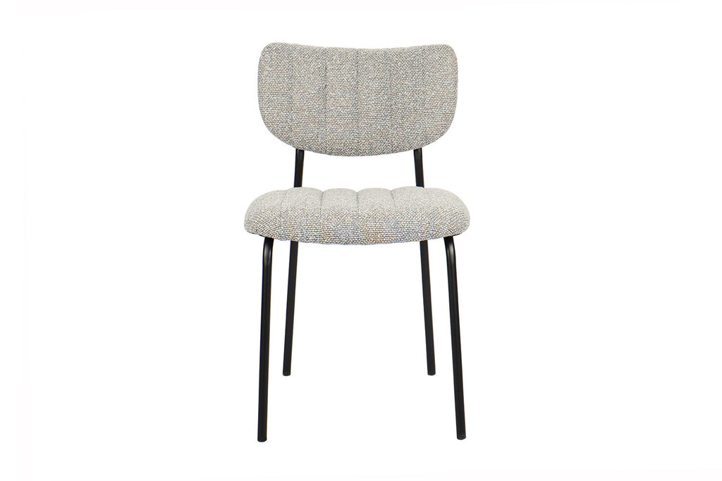 De rugleuning en zitting zijn licht gewelfd en voorzien van verticale stiknaden, wat niet alleen een stijlvolle afwerking geeft, maar ook extra zitcomfort biedt. De slanke zwarte metalen poten maken het geheel luchtig en modern, zonder in te leveren op stevigheid.