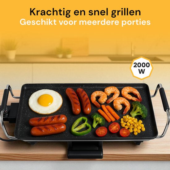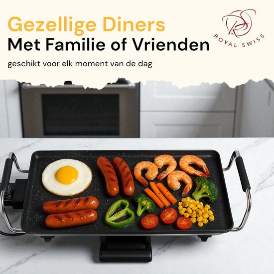 Royal Swiss Elektrische Grillplaat 2000W – Bakplaat 46×26 cm – Anti-aanbak – Thermostaat – Vetopvangbak