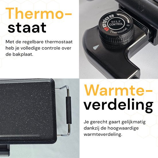 De regelbare thermostaat geeft je controle over de temperatuur, terwijl de vetopvangbak overtollig vet opvangt voor een net werkblad. De Cool Touch-handgrepen zorgen voor veilig verplaatsen en de antislipvoetjes houden de grillplaat stabiel op tafel of aanrecht.