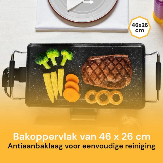 Snel en krachtig grillen voor meerdere porties? Deze Royal Swiss elektrische grillplaat (plancha/tafelgrill) van 2000W heeft een ruim bakoppervlak van 46×26 cm en zorgt voor een gelijkmatige warmteverdeling. Dankzij de anti-aanbaklaag bereid je vlees, vis, groente en ontbijtfavorieten met minder vet en maak je de plaat eenvoudiger schoon.