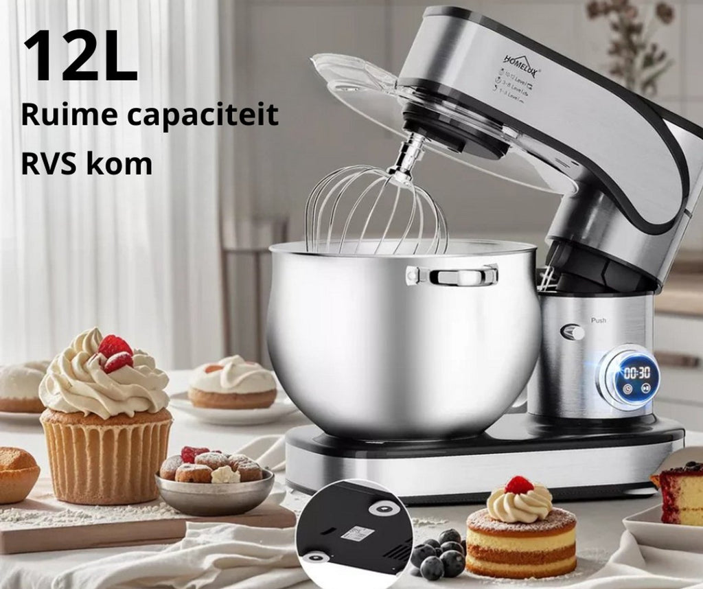 De 2800W keukenmachine met 12 liter RVS kom is een krachtige en veelzijdige hulp in elke keuken. Met zijn robuuste metalen tandwiel systeem en extra sterke motor is deze keukenmachine ideaal voor het kneden van deeg, kloppen van room of het mengen van beslag. Dankzij de ruime 12 liter RVS kom met handige handvaten bereid je moeiteloos grote hoeveelheden – perfect voor thuisbakkers en kookliefhebbers.