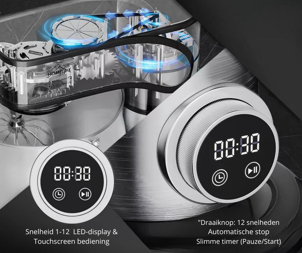De keukenmachine beschikt over 12 digitale snelheden, een touchscreen bediening en een ingebouwde timer voor maximale controle tijdens het bakken en koken. De machine stopt automatisch na afloop van de ingestelde tijd, wat zorgt voor extra gebruiksgemak.