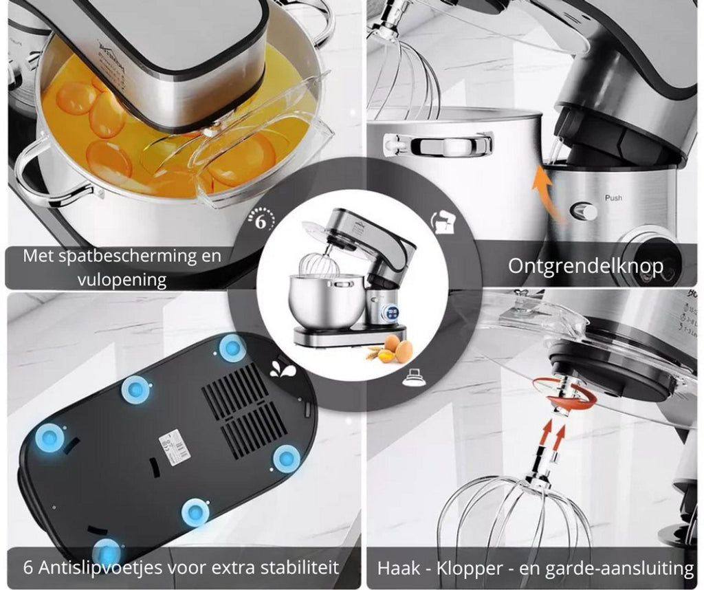 De spatbescherming met vulopening voorkomt knoeien, terwijl de antislip zuigvoeten zorgen voor optimale stabiliteit tijdens gebruik. De keukenmachine wordt geleverd met drie hoogwaardige accessoires: een deeghaak, een platte klopper en een garde – plus een handige spatel.