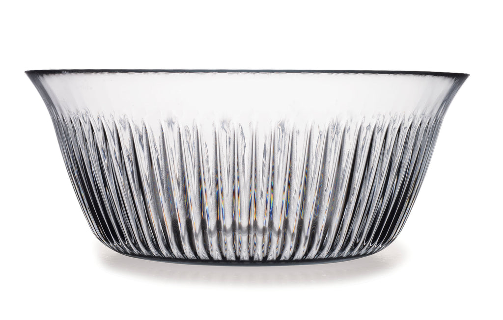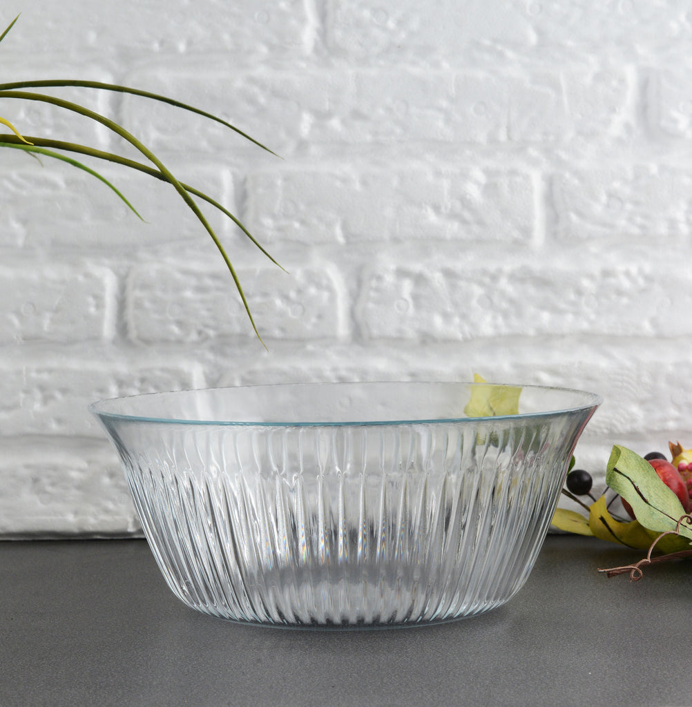 De schaal is gemaakt van hoogwaardig transparant glas met een stijlvol geribbeld patroon, wat zorgt voor een luxe uitstraling en tijdloos design. Het stevige glas maakt de schaal duurzaam en geschikt voor dagelijks gebruik, terwijl de ruime inhoud voldoende plek biedt voor grotere porties.