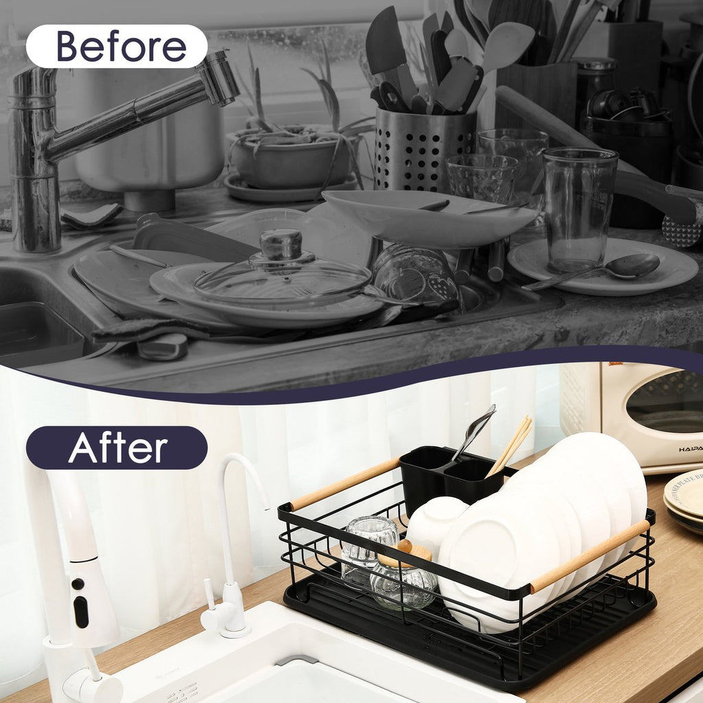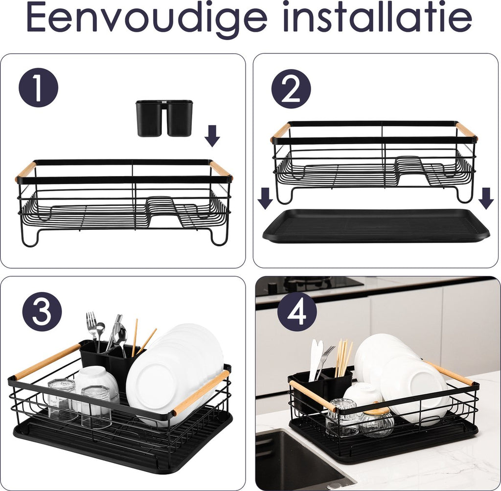 Heb je geen vaatwasser en beperkte ruimte in je keuken? Dan is deze afdruiprek precies wat je nodig hebt. Dit stijlvolle rek combineert een strak, zwart metalen design met warme houten handvatten, waardoor het niet alleen praktisch is, maar ook een elegante toevoeging vormt op je aanrecht.