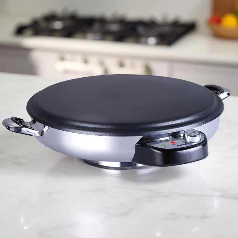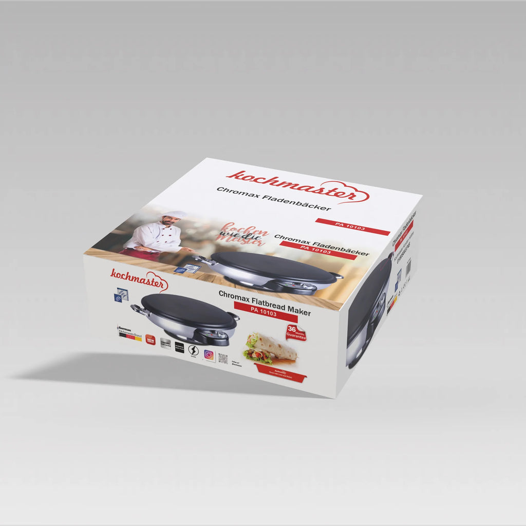 De KOCHMASTER Chromax fladenbakker is de ideale keuze voor iedereen die houdt van verse, goudbruine pannenkoeken, wraps, flatbreads (lavash) en andere deeggerechten. Dankzij de hoogwaardige antiaanbaklaag van aluminium is bakken eenvoudig en blijft niets plakken. Het robuuste RVS-design maakt dit apparaat duurzaam en stijlvol in elke keuken.
