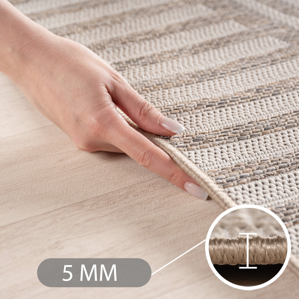 Het vloerkleed DESERT 1301 Beige combineert een stijlvol Japandi design met praktische eigenschappen voor zowel binnen- als buitengebruik. De neutrale beige kleur zorgt voor een rustige en natuurlijke uitstraling, perfect passend in minimalistische of Scandinavische interieurs.