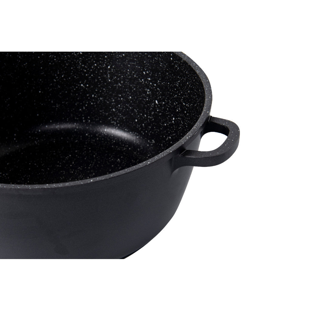 De binnenzijde is voorzien van een hoogwaardige marmeren anti-aanbaklaag die volledig PFOA-vrij en eco-friendly is. Hierdoor kook je niet alleen gezonder, maar ook met minder vet of olie. De pan warmt snel en gelijkmatig op, wat zorgt voor perfecte kookresultaten op alle warmtebronnen, inclusief inductie.