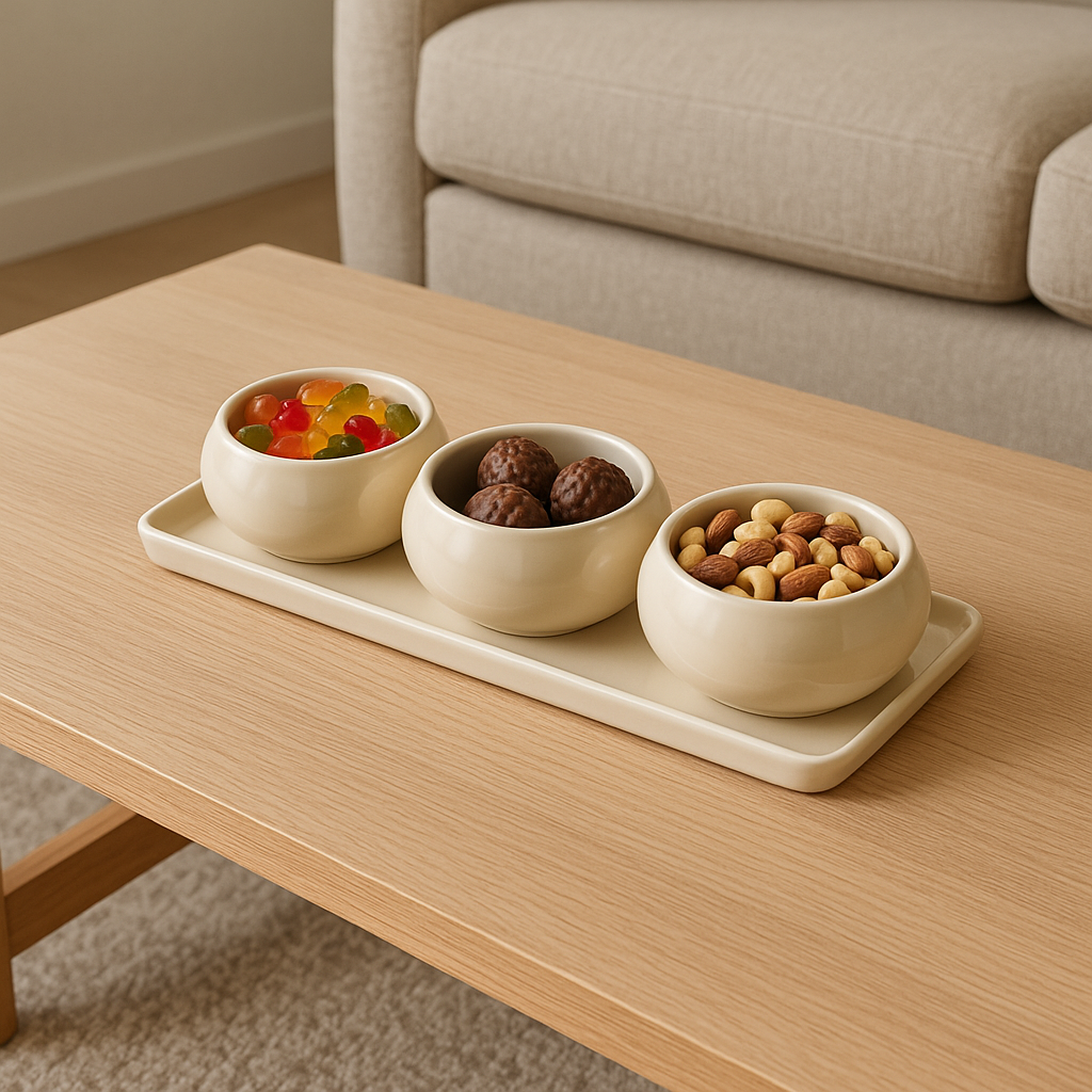 Presenteer hapjes en dips op een stijlvolle manier met de Livenza Cosmo serveerset. Deze 4-delige set bestaat uit drie ronde schaaltjes en een bijpassend plateau in een elegante beige kleur. Ideaal voor nootjes, sausjes, tapas, olijven of kleine borrelhapjes.