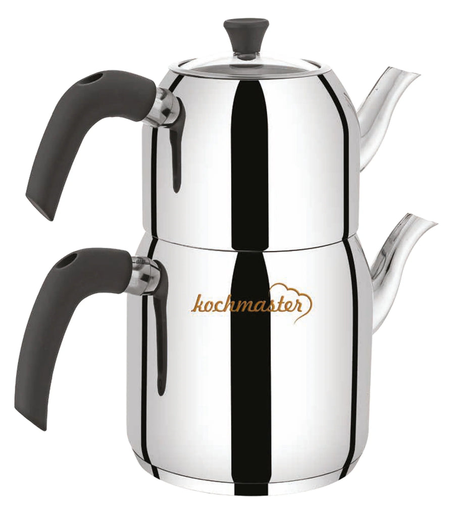 De KOCHMASTER Chromax theepotset brengt luxe, traditie en modern gebruiksgemak samen in één stijlvolle roestvrijstalen theeketel. De bovenkan van 1,25 liter en de ruime onderkan van 2,25 liter bieden voldoende capaciteit om moeiteloos thee te zetten voor het hele gezin, tijdens bezoek of voor ontspannen theemomenten op ieder moment van de dag. Dankzij het hoogwaardige RVS en de hittebestendige glasdeksels wordt de warmte optimaal behouden, terwijl de stevige handgrepen comfortabel en veilig in de hand liggen. Deze theeset is volledig geschikt voor alle warmtebronnen, inclusief inductie, waardoor je overal eenvoudig aromatische Turkse thee of andere theesoorten kunt bereiden volgens de traditionele 2-kannen methode. Terwijl het water zachtjes kookt, vult de heerlijke geur van vers gezette thee de keuken en verandert elke kop in een verwarmend ritueel. Met zijn moderne afwerking in zilver en zwart past deze duurzame Chromax theeset perfect in elke keuken en biedt hij jarenlang betrouwbare kwaliteit en stijl.