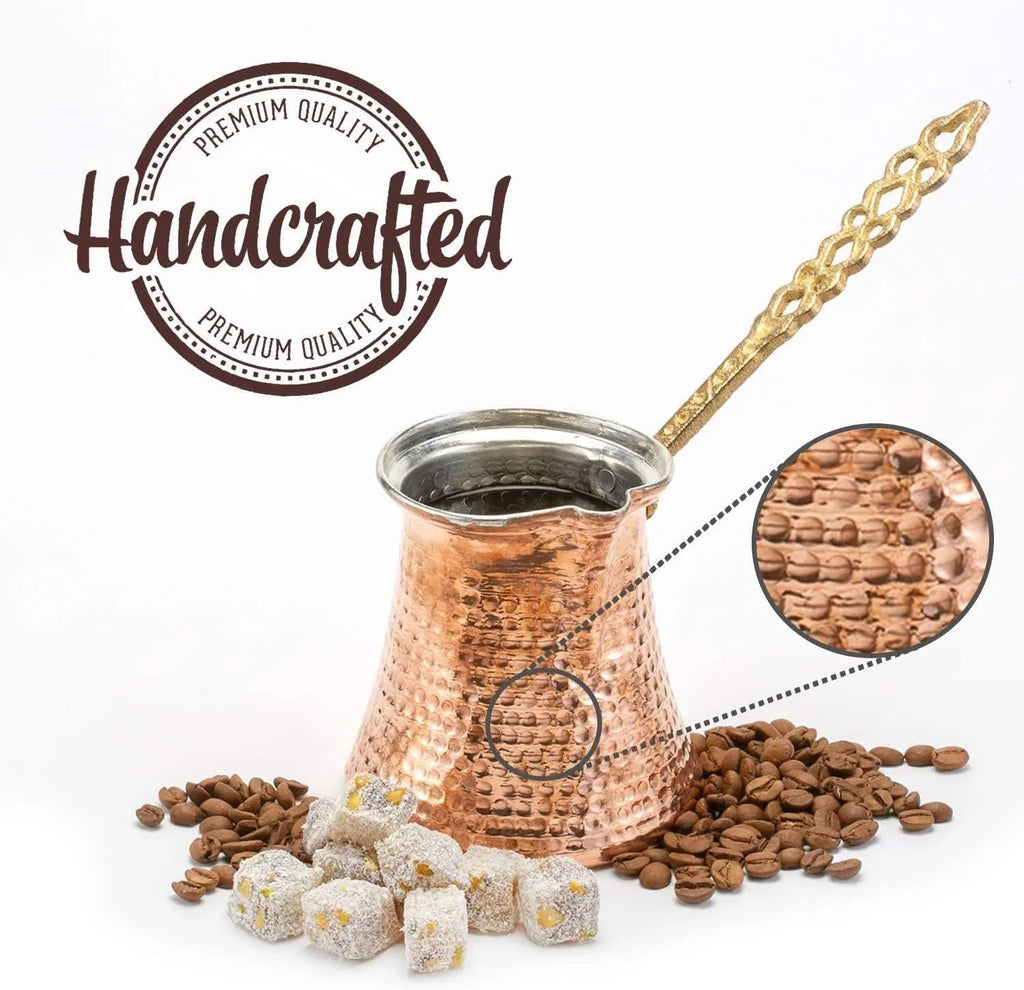 Deze traditionele Turkse koffiekan, ook wel cezve genoemd, brengt de authentieke koffiecultuur rechtstreeks in je eigen keuken. De kan is volledig met de hand vervaardigd uit hoogwaardig koper en voorzien van een duurzame tinnen binnenlaag, waardoor de warmte gelijkmatig wordt verdeeld voor die karakteristieke romige schuimlaag. De sierlijke messing handgreep ligt comfortabel in de hand en geeft je optimale controle tijdens het schenken. Dankzij het ambachtelijke hamerslagdesign heeft elke cezve een unieke uitstraling, perfect voor liefhebbers van kwaliteit, traditie en pure koffiesmaak. Of je nu Turkse koffie zet op gas, elektrisch of een klein fornuisje, deze premium cezve zorgt telkens opnieuw voor een rijke, volle en aromatische koffiebeleving. Een tijdloos stuk vakmanschap dat jouw koffieritueel naar een hoger niveau tilt.
