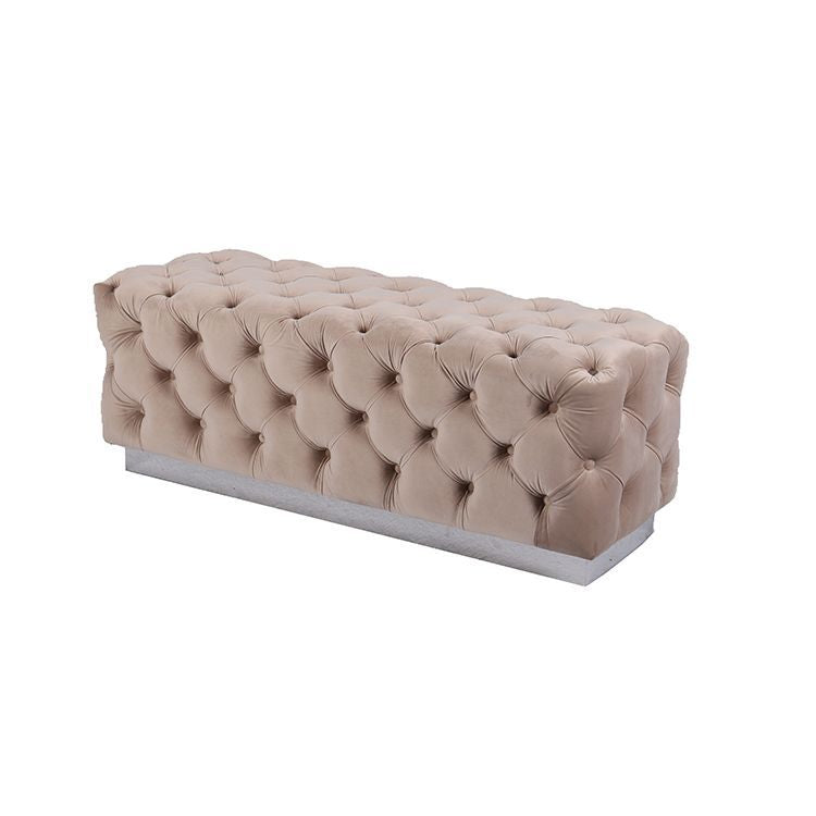 Het Luxury zitbankje Calabria in taupe stof met zilverkleurig onderstel combineert moderne elegantie met tijdloze klasse. De zachte fluwelen bekleding in een warme taupetint zorgt voor een luxe en uitnodigende uitstraling, terwijl het zilverkleurige onderstel een moderne, verfijnde afwerking biedt. De diepe capitonnéstikking met knoopdetails geeft de bank een exclusief karakter dat in elk interieur tot zijn recht komt.